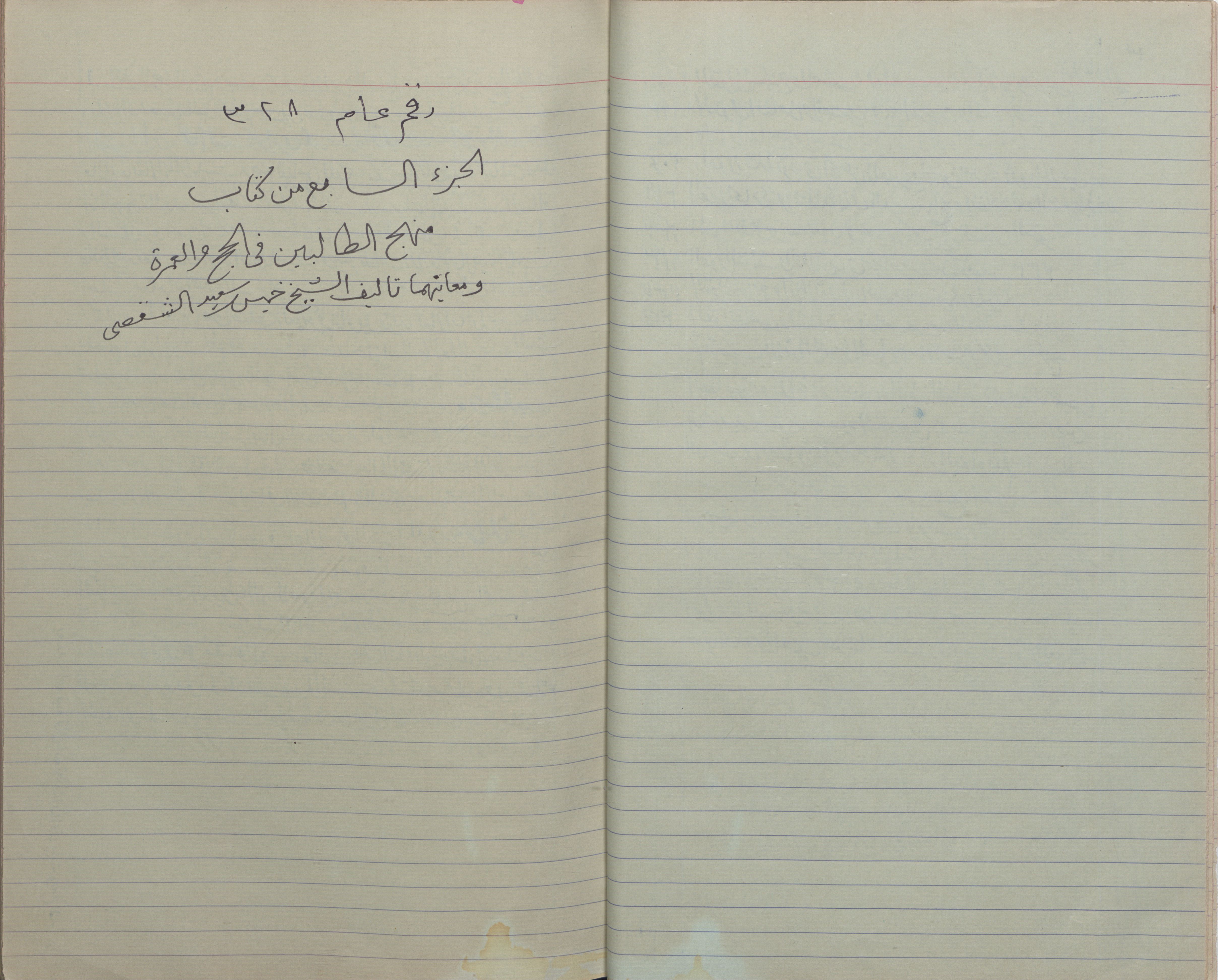 اسم المخطوط منهاج الطالبين ج7 كتاب الحج والعمرة المؤلف الشيخ/ خميس بن سعيد بن علي الشقصي الرستاقي الكاتب علي بن سالم بن ناصر الحجري سنة النسخ الأربعاء 29/جمادي الآخر/1400 هجري