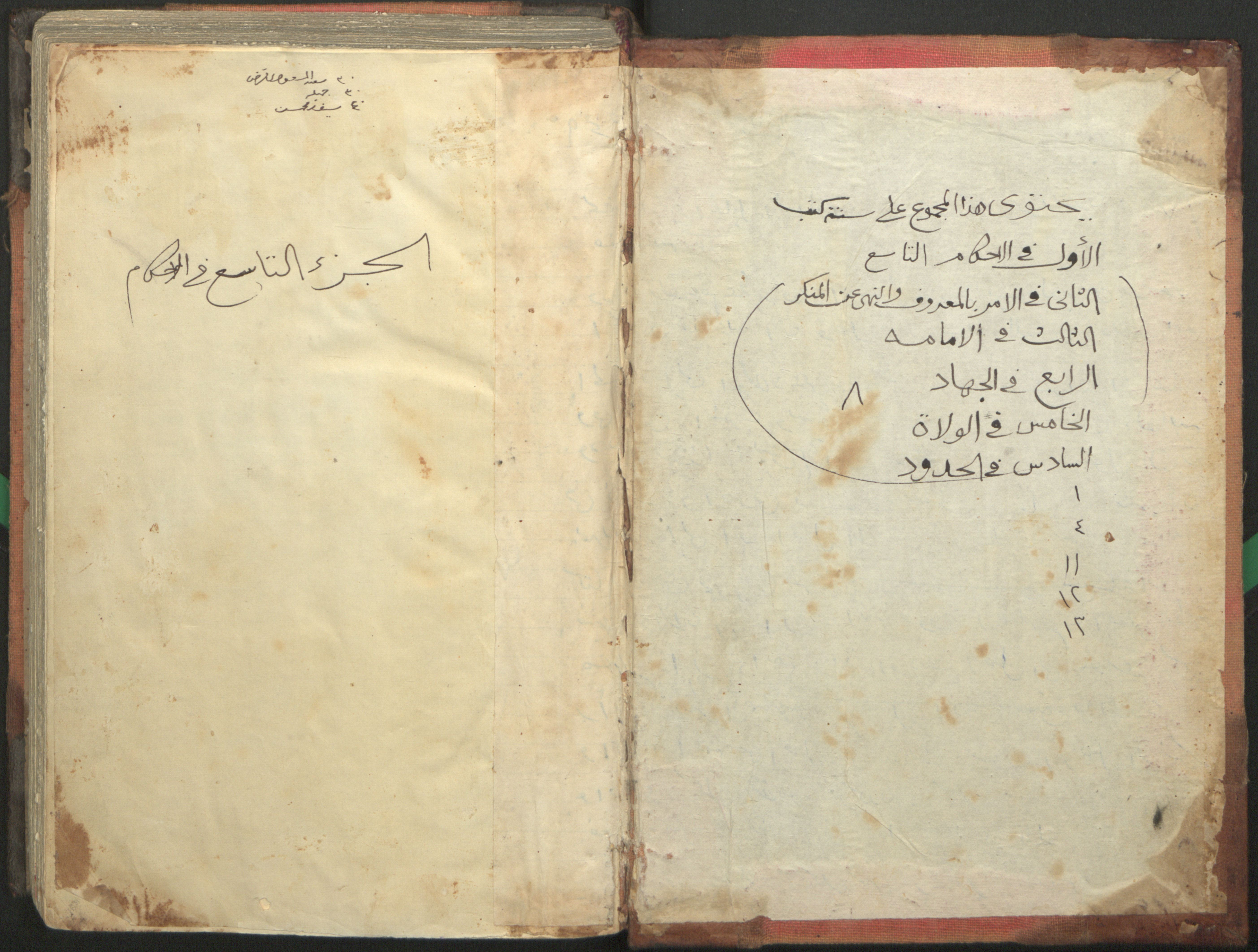 اسم المخطوط منهاج الطالبين ج8 (في الأمر بالمعروف والنهي والأمامة والجهاد والولاة والحدود) و ج9 في الأحكام المؤلف الشيخ/ خميس بن سعيد بن علي الشقصي الرستاقي الكاتب سالم بن حمد بن سليمان الحارثي سنة النسخ 1/رجب/1381 هجري